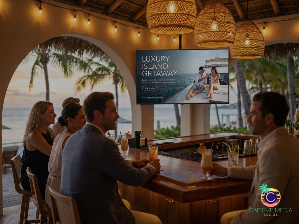 In a world of scroll-past ads and banner blindness, Captive Media Belize delivers something rare: genuine attention. We place your brand on premium TV screens in high-traffic bars, beach clubs, and resorts across Belize. When people sit down with a cold drink to watch the game, catch the weather, or simply unwind, your ad is right there—impossible to skip, scroll past, or ignore.